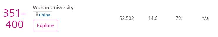 詹姆斯库克大学位列第201-250位,这是大学连续第三年被评为世界前250所大学之一。紧随其后的是中山大学、南开大学、武汉大学、同济大学、哈尔滨工业大学等国家双一流大学。