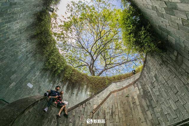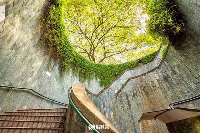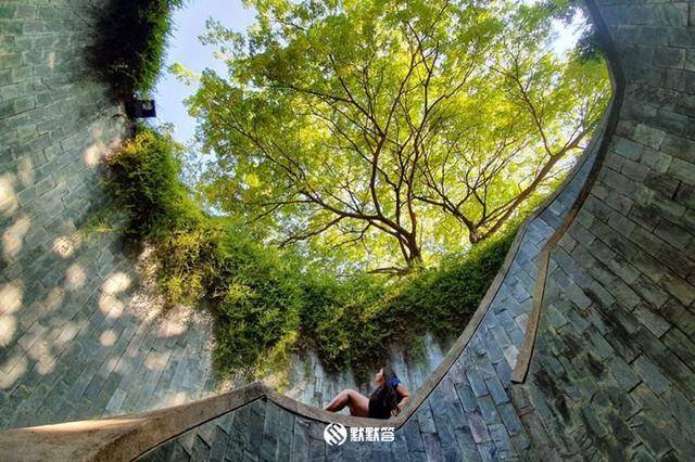 在井底往上看,茂密的绿植要铺满整个天空,井边挂满绿色墙蔓,如同失落仙境一般。