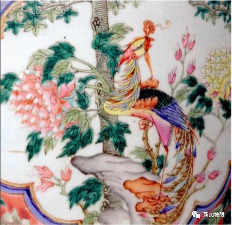 ▲娘惹瓷上的凤凰:眼睛狭长,富有媚态;全身色彩鲜艳,注重细节刻画。