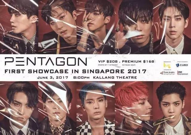 演出介绍:Pentagon是韩国CUBEentertainment于2016年10月10日推出的韩中日男子团体合唱组合,由赵珍虎(JinHo)、李会泽(Hui)、梁洪硕(Hong Seok)、金孝钟(E’Dawn)、高信源(Shin Won)、吕畅九(Yeo One)、闫桉(Yan An)、安达祐人(Yuto)、姜炯求(Kino)、郑宇硕(WooSeok)10位成员组成。2016年4月26日,PENTAGON公开首支出道预告《PENTAGONTrailer ~come into the world~》,首次正式公开亮相;5月2日,PENTAGON组合出道真人秀节目《PentagonMaker》正式播出;10月10日,发行首张迷你专辑《PENTAGON》,正式出道;12月2日,入围MAMA亚洲音乐大赏最佳男子新人奖; 6日,举办首场迷你演唱会; 7日,发行第二张迷你专辑《Five Senses》。这将是该团队首次来狮城巡演。