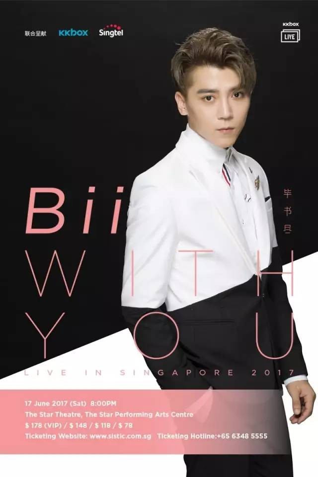 演出介绍:KBOX 及Singtel 联合呈献,2017 Bii 毕书尽年底站上台北小巨蛋前唯一一场音乐会【毕书尽Bii With You LIVE in Singapore 2017】将在6 月17 日,晚上8 点,于新加坡TheStar Theatre, The Star Performing Arts Centre 隆重登场!这场新加坡独家专场音乐会将以两个小时的 LIVE Band 高规格形式呈现,Bii在准备歌单上也十分用心,不管摇滚或抒情都希望在歌迷面前呈现最完整的自己。此外, Bii还准备与粉丝们展开最零距离的互动,给现场粉丝带来最棒的粉丝福利!
