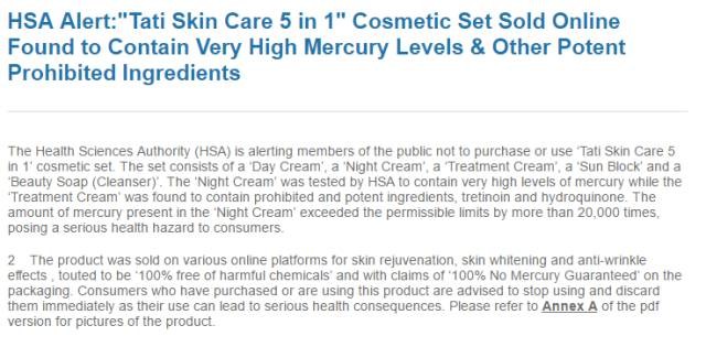 这几天,新加坡卫生科学局对此发布警告:一种名叫“Tati Skin Care”的护肤品,水银竟然超标20,000多倍!
