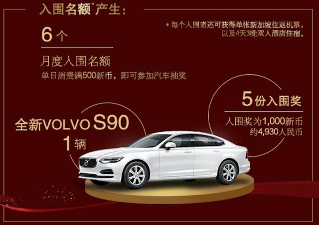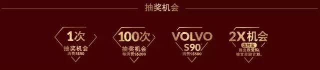 增加抽奖机会!50新币算一次,但是每满200新币,就可以多100次抽奖机会!满500新币,就可以获得沃尔沃豪车的抽奖机会。