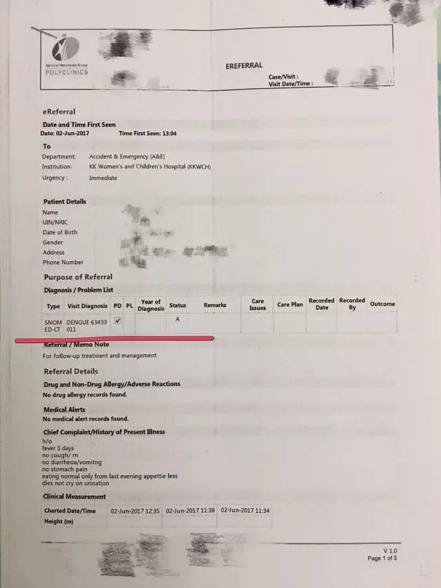 我和婆婆面面相觑,心说最近也没被蚊子咬过,怎么就疑似登革热了呢?问医生接下来该怎么做,医生让第二天再去验血,血小板再降的话说明是登革热,要转诊到KKH。我心想不如直接转诊去KKH—-万一真是登革热,也省得再跑一次医院。于是要求医生开了转诊信,第二天直接去KKH。