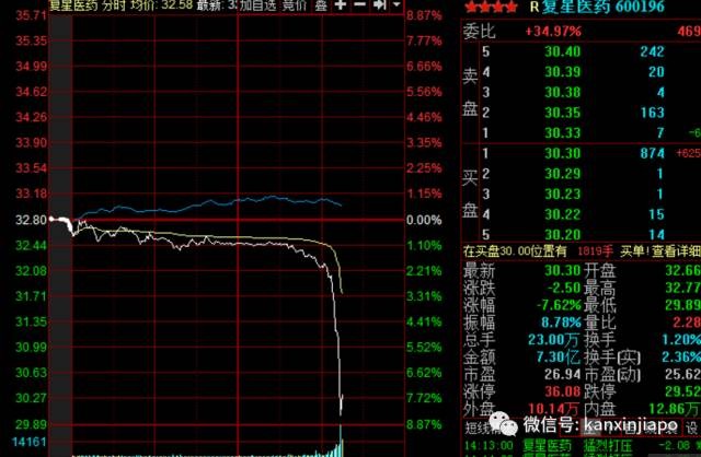 复星在内地上市的医药分公司上海复星医药在沪市的股价,短时间内也暴跌了8.9%之多!