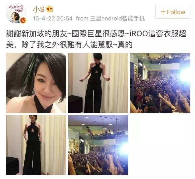 去年在Raffles Shopping Center做iROO的开幕嘉宾,小S自己也经常会发微博,说来到新加坡~