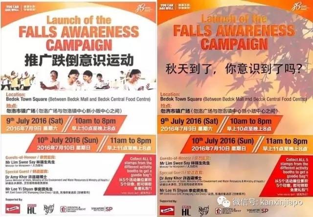 新加坡保健促进局原本是要用这张海报,宣传“防范跌倒运动”(Falls Awareness Campaign),结果翻译之后,活动名称却成了“推广跌倒意识运动”。