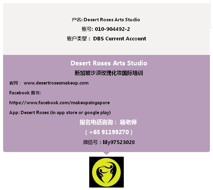 专业课考试合格,您将取得新加坡沙漠玫瑰国际化妆培训 Desert Roses Arts Studio颁发的专业化妆师证书。新加坡政府鼓励自我提升和不断进修,这个证书将为您申请各种准证起到积极作用。这也是您人生的一个里程碑,我们希望,这是您一个崭新的化妆事业的开始。您在新加坡沙漠玫瑰学到的学习能力和工作能力也将为您寻找新的工作奠定必须的能力。我们不仅仅在学习过程中给学员大量实践机会,也会为毕业生推荐各种兼职和全职工作,优秀学员也欢迎加入我们公司的专业团队。我们的终身交流平台也会不断提供发展的潮流趋势,工作机会和进修机会。