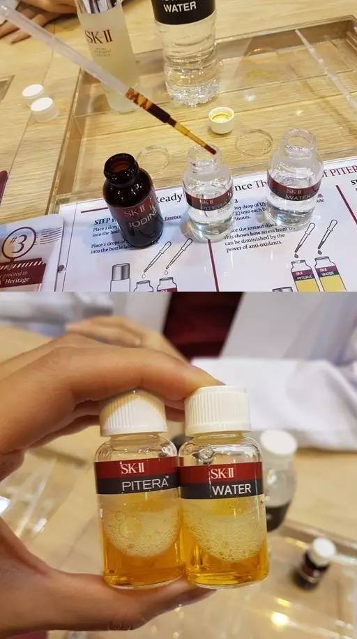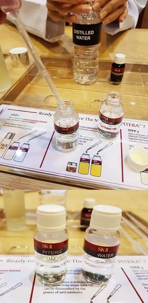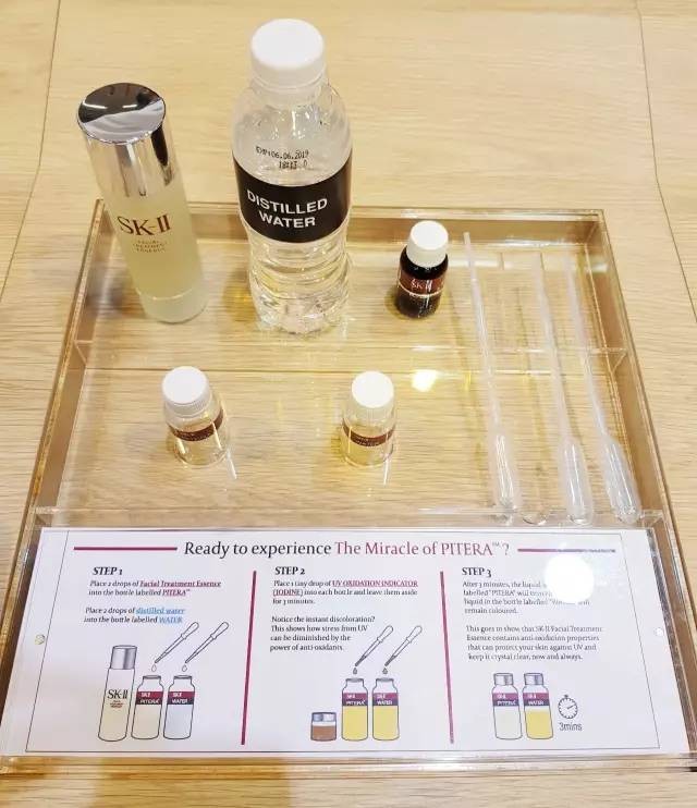 首先要知道Pitera是什么?科学家们在清酒酿造厂,发现酿酒师满布皱纹的脸和他们细嫩的双手,形成了强烈对比,于是从350种酵母中找到其中一种加以提炼,也就是Pitera。它是一种蕴含丰富维生素、氨基酸、矿物质及有机酸的透明液体,与肌肤的天然保湿因子(NMF)成分极为相似,能明显地改善肌肤表皮层的代谢过程,提升及维持肌肤透亮、柔嫩及细滑度,让肌肤晶莹剔透(摘自SK-II官网)。在这部分要体验的是Pitera如果帮助肌肤重返晶莹剔透的过程。
