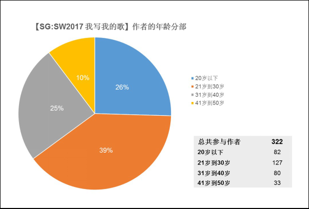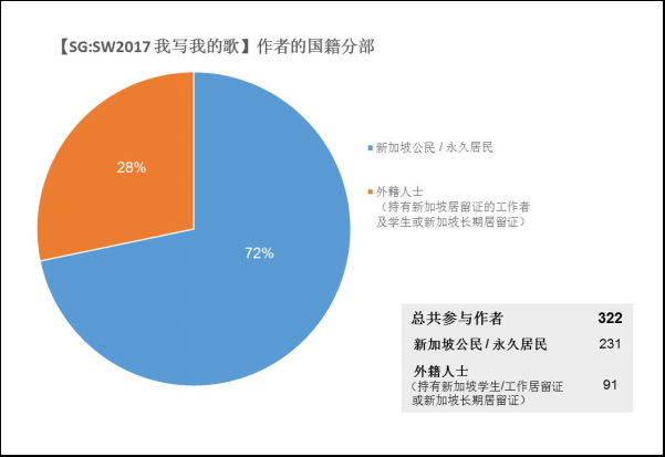 参与作者非常丰富,从15岁到54岁,也来自各种专业 【SG:SW2017 我写我的歌】中文歌曲创作节规定让每位作者能以最多3首作品报名, 不限制词曲作者须是同一个人,虽然如此, 却还是有322位参与作者, 其中231位是新加坡籍人士,其余则是在新加坡长期居留的外籍学生、工作人士 等。而长期居留的外籍人士来自中国、台湾、马来西亚、加拿大, 甚至英国。