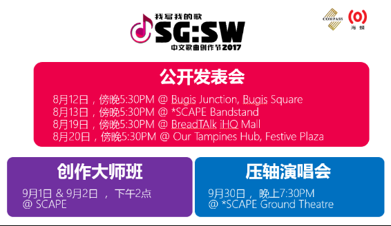 关于 【SG:SW 2017 我写我的歌】中文歌曲创作节 由新加坡词曲版权协会(COMPASS)与海蝶音乐联合主办的【SG:SW2017 我写我的歌】是一个中文歌曲创作节,希望能借此活动挖掘本地音乐人才之外,也能逐渐建立一个属于当代的本地歌曲和文化。迎合现代年轻人的思维和习惯, 配合现代科技发展的态度下所策划的节目,专对新加坡流行音乐有深厚兴趣及热情的朋友而设,也坚持原创精神。 【SG: SW 2017 我写我的歌】并非一场创作比赛, 而旨在推广本地中文原创音乐,激发潜力无限的本地音乐生力军的创作欲望,通过这个平台发表其原创作品,尽展音乐才华,广邀各界发掘优秀的本地中文音乐创作者。 未来的新加坡流行音乐推手,也许就是你!