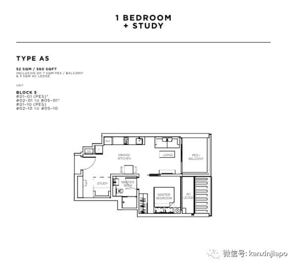 一居室 + 书房户型:套内面积52平方米(560平方英尺)至57平方米(614平方英尺),平均售价$2203新币每平方英尺,整套售价$116万起;