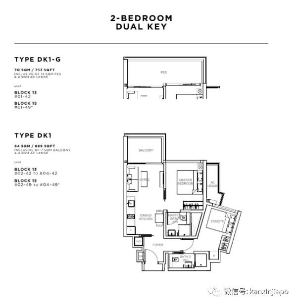 二居室双钥匙户型:套内面积64平方米(689平方英尺)至70平方米(753平方英尺),平均售价$2057新币每平方英尺,整套售价$140万起;