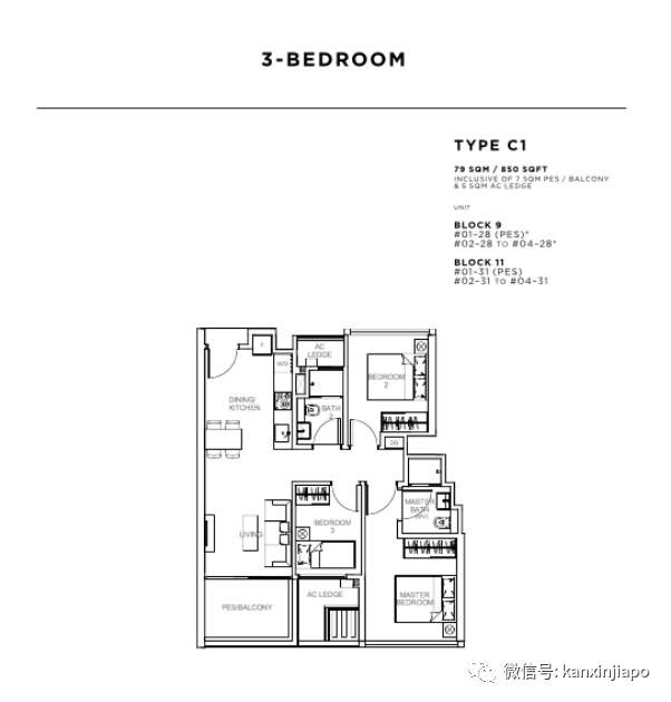 三居室双钥匙户型:套内面79平方米(850平方英尺)至91平方米(980平方英尺),平均售价$2147新币每平方英尺,整套售价$170万起;