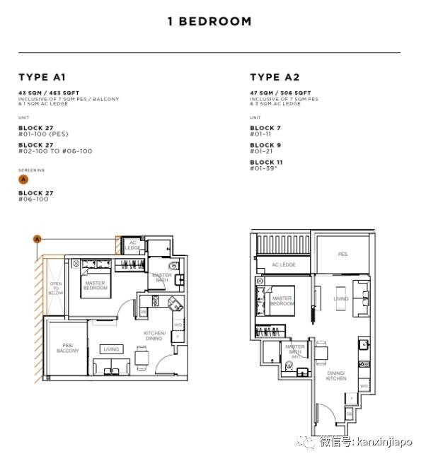 一居室户型:套内面积43平方米(463平方英尺)至48平方米(517平方英尺),平均售价$2205新币每平方英尺,整套售价$110万起;