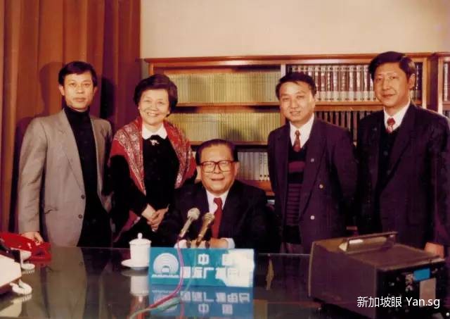 ▲为前中国主席江泽民录制新年献词后合影。站立者右起:首席录音师、国际电台台长张振华、杨淑英、我。