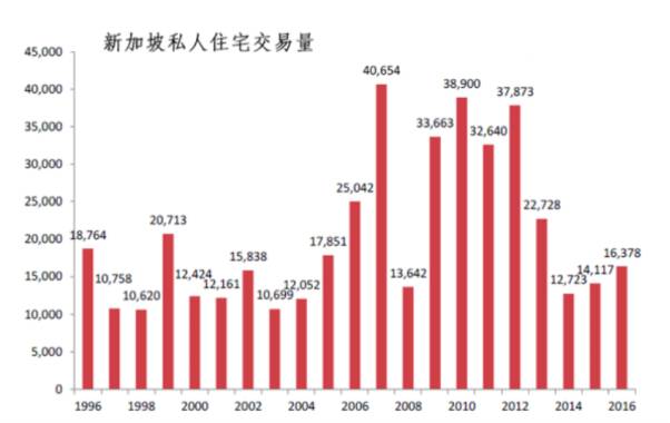 在成交量方面,自新加坡政府从2012年10月,采取第一轮房产调控政策以来,十轮市场政策调控见证了过去4年成交量的快速下跌,尤其是在2013年实施的卖方印花税(Seller Stamp Duty, SSD),对公民的第二套房产和永久公民的第一套房产征收额外买方印花税(从5%增至7%)和对总偿债率的限制使新加坡私宅市场的成交量,从2012年的37,837套大幅下降至2014年成交量的12,723套。