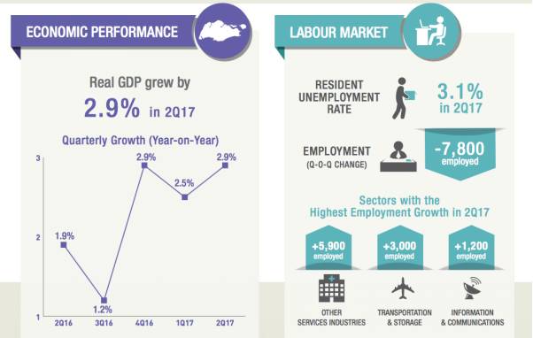 根据新加坡贸工部的数据显示,2017年一季度新加坡经济同比缓和增长2.5%,第二季度则进一步增长了2.9%,预计全年增长2.2%,较2016年的2%增长了0.2%。