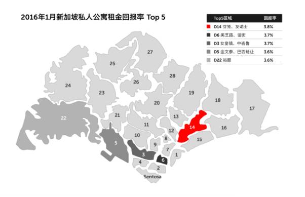 Suites@Eastcoast 位于勿洛区域,拥有最高出租收益率,高达5.7%;The Clift 位于中央商务区内,出租收益率达4.8%;Vista Park 位于女皇镇,出租收益率达4.7%;Park West 位于金文泰,出租收益率达4.6%,周边区域同类型的房产一样具有较高的出租收益潜力。其他拥有高于平均收益率的楼盘有以下几个:加冷地区的Kerrisdale, Downtown Core的Skysuites@Anson, 武吉知马的Glentrees, Downtown Core 的Icon, 淡滨尼的Melville Park和巴西立的Loyang Vallet。