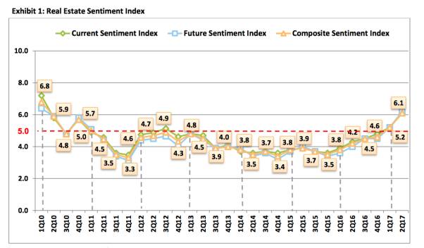 由产业发展商公会(REDAS)和新加坡国立大学公布的最新一季房地产行情指数(Real Estate Sentiment Index,简称RESI)显示,今年第二季的综合行情指数(Composite Sentiment Index)和当前行情指数(Current Sentiment Index)均由第一季的5.2上升至6.1;当前行情指数追踪过去六个月的乐观程度。