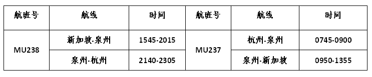 8月25日,东航成功开通新加坡-泉州-杭州航线。航班号为MU237/238,由空客 320 机型执飞,周二、三、五、日各执行 1 班往返。泉州是中国首个东亚文化之都,是海上丝绸之路起点,在新加坡福建人占到新加坡华人约43%,是新加坡华人社区当中最大的民系,而在福建人当中,祖籍为泉州的是最多的;杭州是中国互联网城市的代表,是阿里巴巴的总部所在,同时杭州也是中国华东地区第二大机场。此次东航新航线的开通,将有助于进一步提升泉州、杭州及新加坡在人文、经贸、商务等多领域的合作交流,同时对于三地旅游事业的发展将起到积极的促进作用。