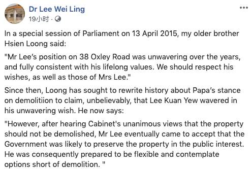 “在2015年4月13日的国会特别环节,我的哥哥李显龙说:“李光耀先生对于欧思礼38号故居的立场多年来坚定不移,与他终身价值观完全一致。我们应尊重他与妻子的意愿。”