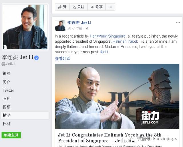 李连杰原文大意是说“曾经一篇时尚杂志《她的世界》(Her World Singapore)的文章中提到,原来新加坡新当选的总统哈莉玛是我的粉丝。他为此深感荣幸,也望她一切顺利”同时下面还转载了了篇发表于“街力”(jetli.com)官网文章,题目显赫地写着“李连杰祝贺哈莉玛成为新加坡第八位总统”。