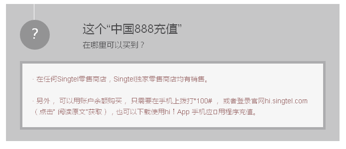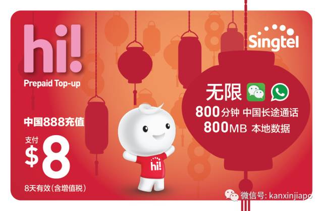 他们最近推出的“中国888充值”套餐,可享受这3大刚需优惠:无限使用微信和Whatsapp、800分钟中国长途电话(v019),4G的800MB 本地数据。只需S$8(近40元人民币)。要使用“中国888充值”,首先要买一张$15的hi!SIM卡。