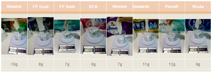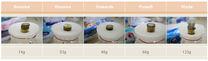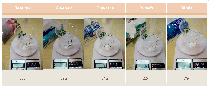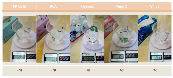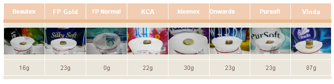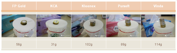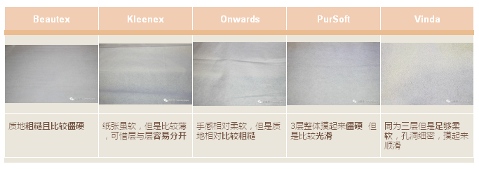 总结: 这轮里面,维达表现最优,同为3层的Kleenex和PurSoft表现稍弱,2层的KCA表现最不理想啦