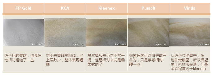总结:柔软程度,Kleenex有绝对优势,但是vinda和pursoft相对有质感,细腻程度上Vinda和Kleenex胜出