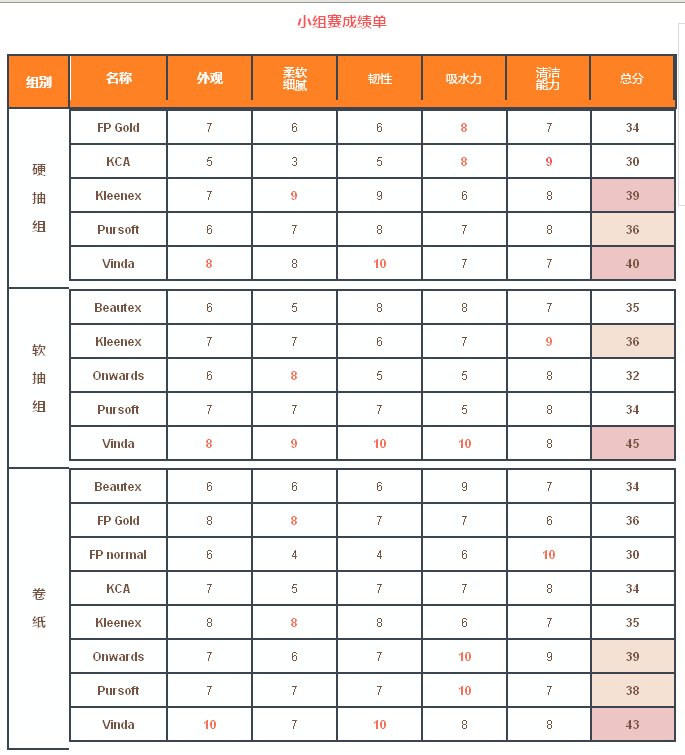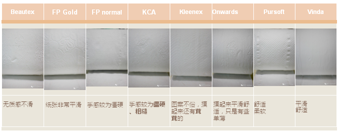 比试结果非常明显了, kleenex基本不见踪影,onwards、Vinda和pursoft紧随其后留下个虚影,Beautex表现较弱,