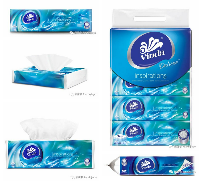 Vinda Deluxe Box Pack Facial Tissue : 国内的小伙伴几乎都用过,在纸厚耐用,不玩花样,事实证明也是最受欢迎的,连续九年在中国卫生纸市场排名第一,价格也不贵。外观上对比起来,是一股清流了,身在每天热到爆炸的坡国,看到就会coooool下来了吧。