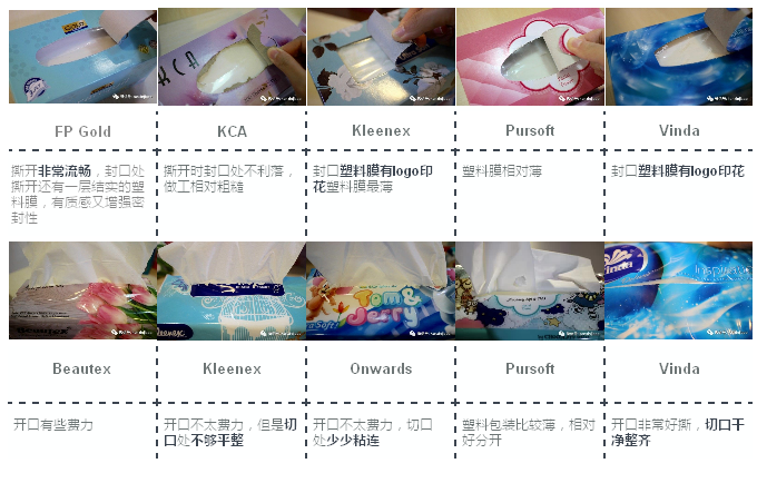 盒子的开口设计,决定开封时能否被完整保存。小细节更能彰显用心。我们分别沿虚线,撕开了五款抽纸的开口~