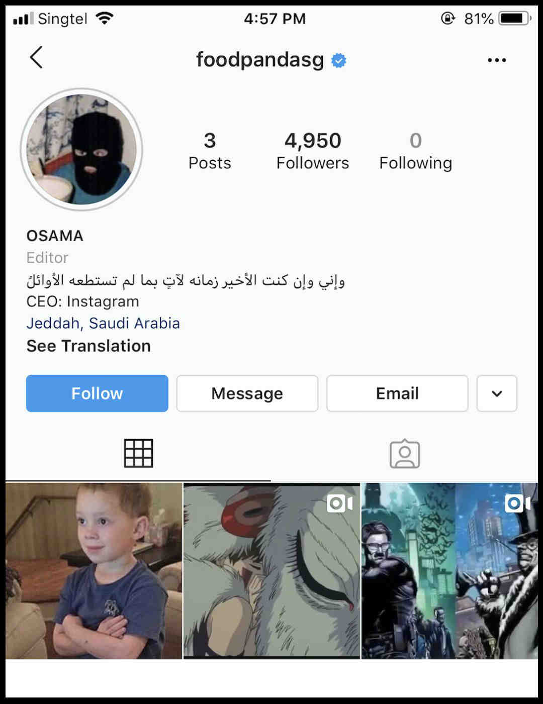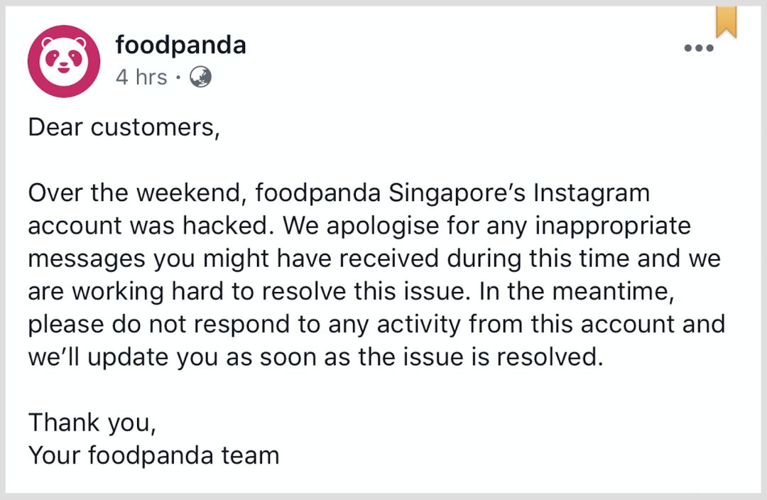 今天下午,Foodpanda在官方Facebook上发公告,说他们的Instagram账号被盗了。