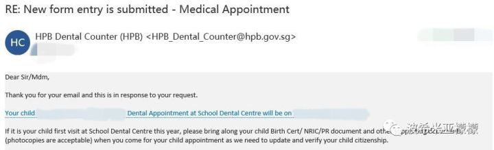(2)只要是在新加坡有长期居留身份的小朋友(DP/student pass/PR/Citizen)都可以去保健促进局的学校牙医中心预约,无需额外的介绍信,预约提交大约半天以后,就会收到确认邮件,里面写明了分配给你的具体时间,通常预约时间在2-3个月以后。