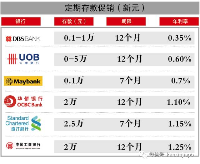 差别居然这么大!从0.35%到1.25%,原来各银行之间定期利率都有好几倍之差啊!中国工商银行新加坡分行的定期存款利率是表里最高的,关键是,最近还打听到了更劲爆的存款促销,利率高达2.18%。什么概念?居然比其它银行的定期存款利率,足足高出6倍多~!