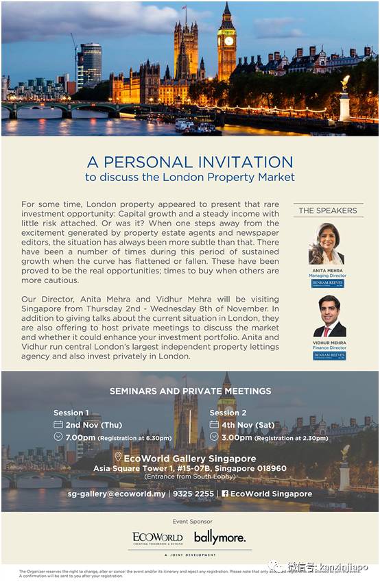 11月2日和4日,一场关于伦敦房产政策和投资市场的讲座将在新加坡绿盛世(EcoWorld Singapore)展厅举行,专家将为有兴趣在伦敦投资高端房产的潜在投资者分析伦敦房产的升值空间以及现状。