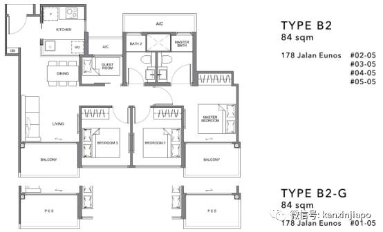 三卧室加客房,套内面积83平方米(893平方尺)至86平方米(926平方尺)。指导单价$1533新元/平方尺起,整套售价S$1,369,000 – S$1,496,000。这个房型的特点也是南北朝向,户型方方正正,布局合理,无浪费空间,两个普通房均可放置双人床。而且厨房与餐厅是分开的。非常适合有2个或以上小孩的夫妻,以及出租给专业人士和学生。