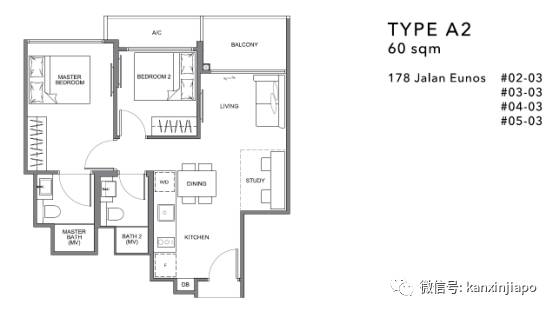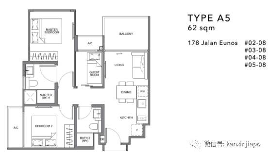 二卧室加客房,套内面积62平方米(667平方尺)。指导单价$1515新元/平方尺起,整套售价S$1,010,000 – S$1,056,000。这个房型的特点也是南北朝向,户型方方正正,布局合理,无浪费空间,普通房也可放置双人床。非常适合有1-2个小孩的夫妻,以及出租给专业人士和学生。