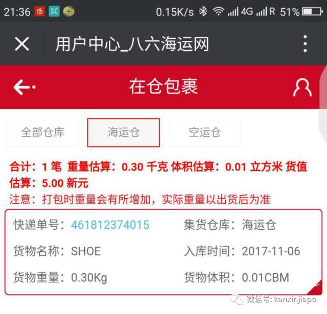 3、货物到仓库,微信自动通知您,你可以看到每一个包裹的重量和体积、图片: