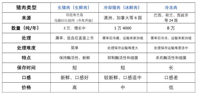 科普活着运到新加坡的猪,会在新加坡本土进行屠宰、放血等简单处理后,直接上市,这样的猪肉比较新鲜,口感也好,被称为生鲜肉或者生猪肉。2、来自澳大利亚、加拿大等6个国家的冷却猪肉(也叫冰鲜肉)。这些猪肉在当地被屠宰后,在-20℃环境下被急冻,以抑制酶的活性和细菌繁殖,再在类似冷藏的状态下,被运到新加坡。