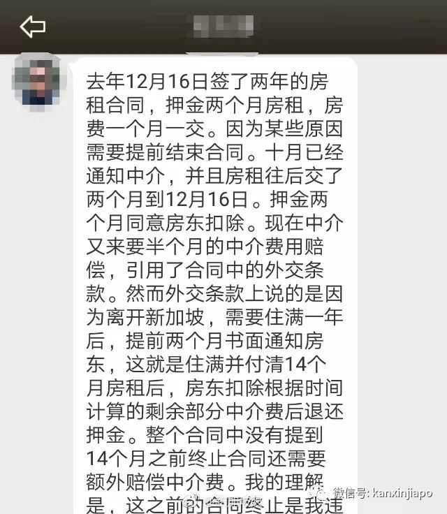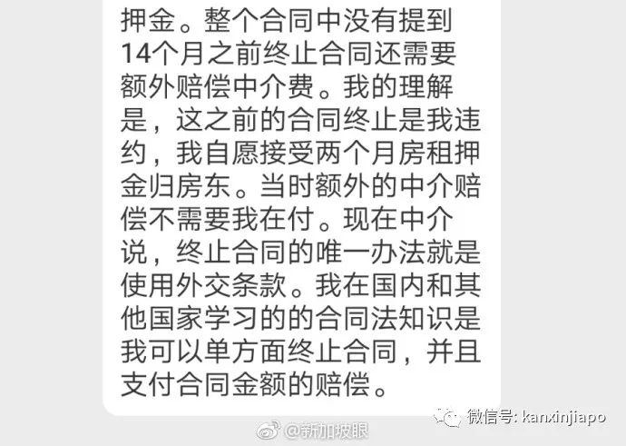 还有,如果中介不提出使用外交条款,新加坡的租赁合同是不能违约的,不是你自己觉得我的押金不要了,再赔偿你一些钱就可以了,这是自以为是的表现。在新加坡,只要你没有履行合同,你需要赔偿剩余所有月份的房租给屋主。所以,在这方面,中介提出使用外交条款,实际上是在帮租客。