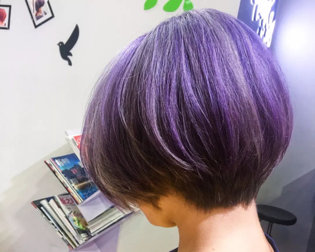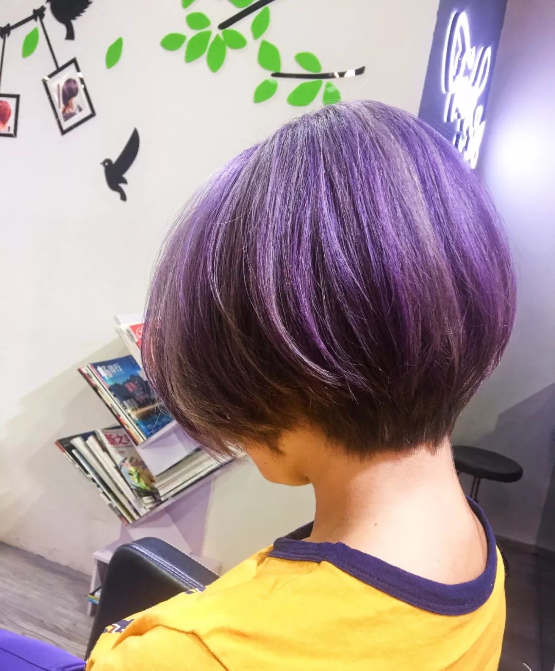 “你的肤色偏黄,不适合大面积染紫色,灰色作为底色,衬肤色白,挑染一些紫色,效果比较好。”