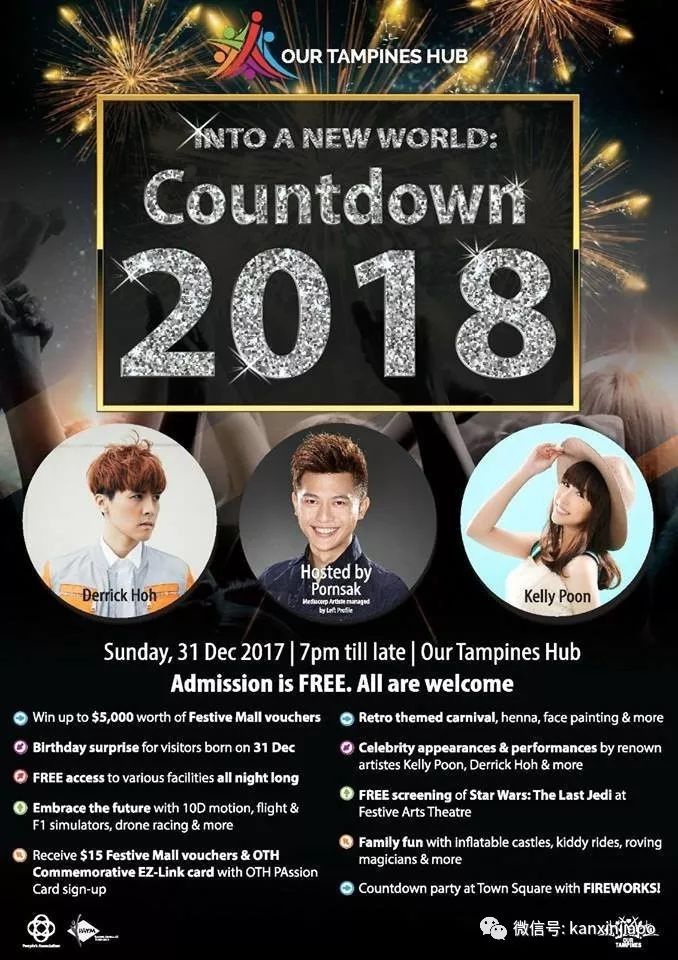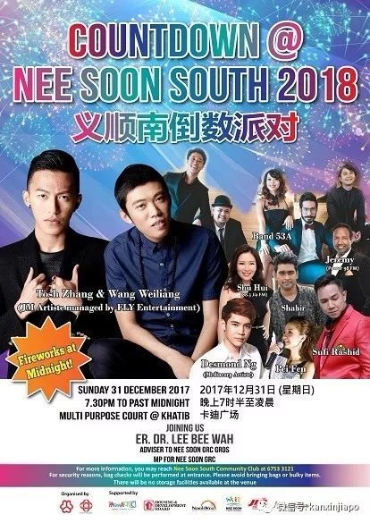 如果不想到市区凑热闹人挤人,那么你也可以在邻里社区参加跨年倒数派对,不仅有烟花看,还可以看到像Tosh Zhang这样的新加坡知名艺人哦!