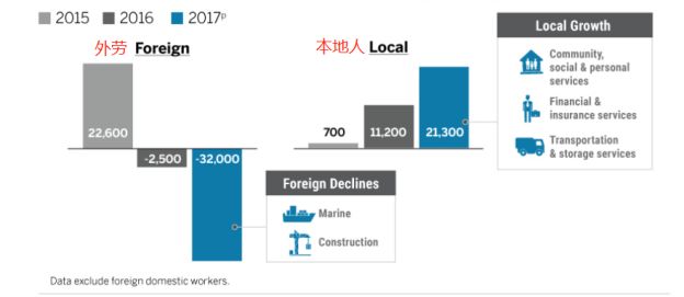 而外劳(不包括帮佣)减少主要是因为建筑业和海事业的工作准证持有者大量削减。下图中不难看出,2015年新加坡新增外劳22600人,2016年外劳缩减2500人,今年一下就少了32000人!