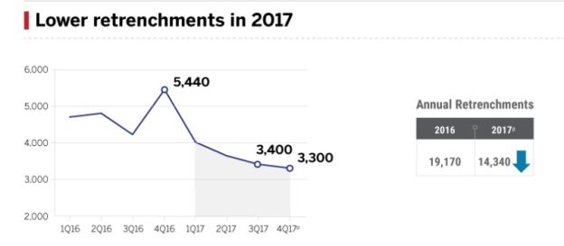 不过,值得庆幸的是,新加坡去年的裁员率比2016年稍稍有点降低,从2016年的19170降到2017年的14340。