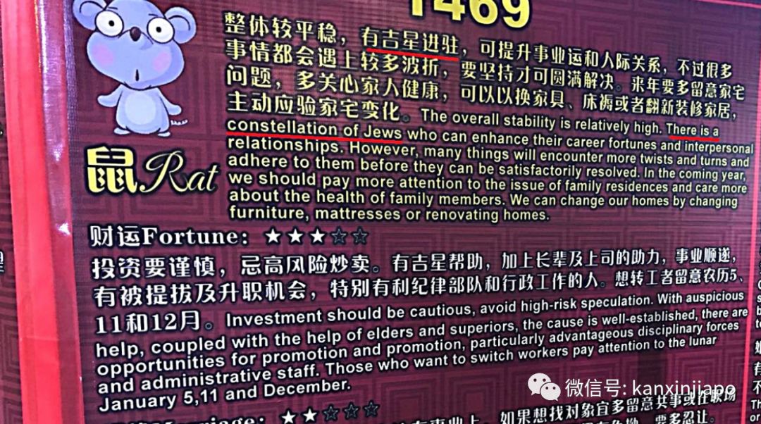再来看看属鼠的,“吉星进驻”翻译的是:有犹太人星座进驻……呃,犹太人表示蒙圈啊,关我们什么事?