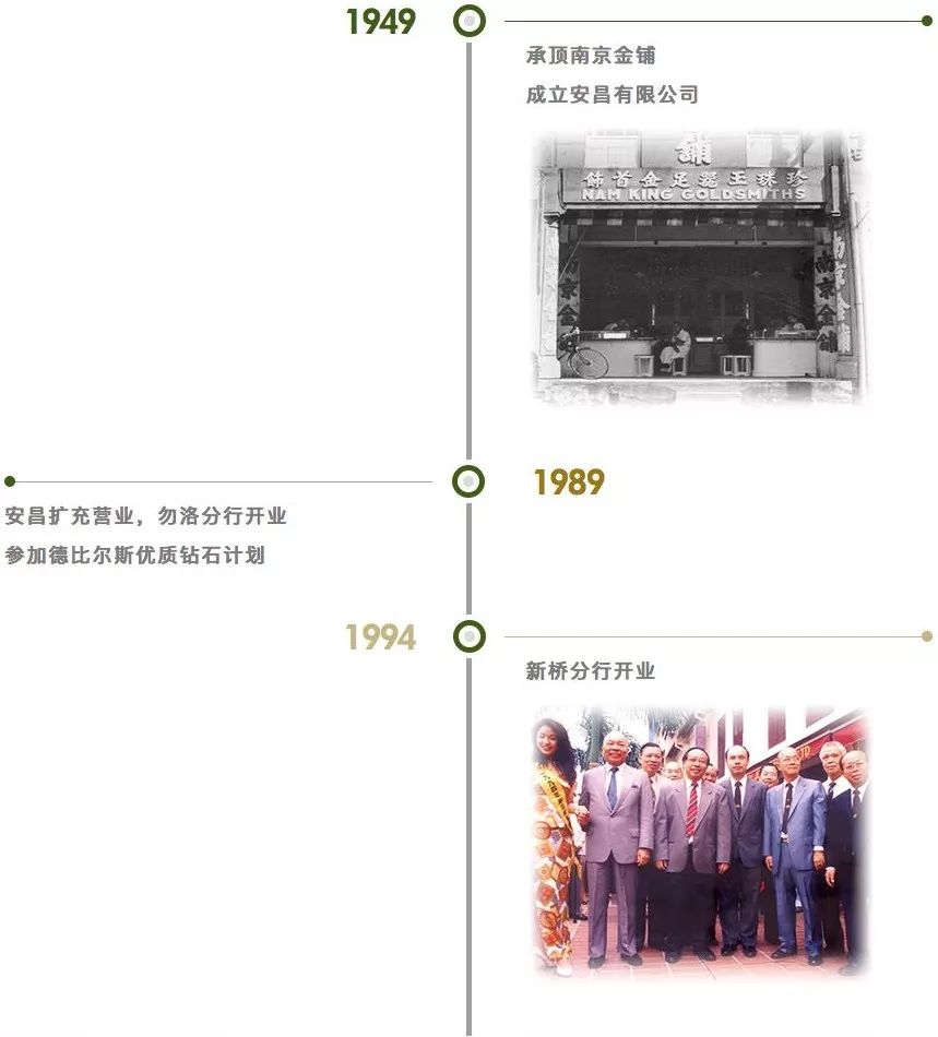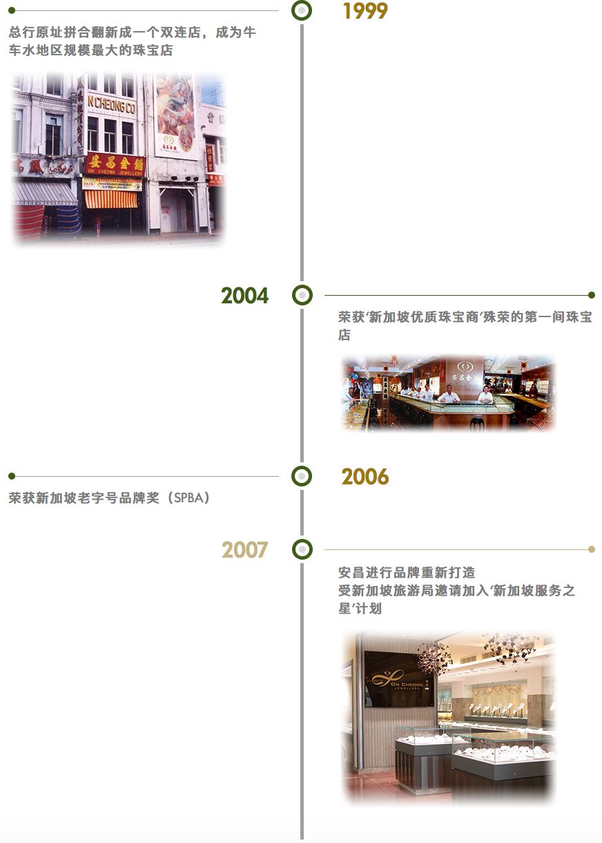 历经岁月洗礼与时局动荡,安昌见证了新加坡的独立、动乱、发展,并和国家一起成长。在2007年重新打造品牌后,将原名“安昌金铺”改为今天的“安昌珠宝”。