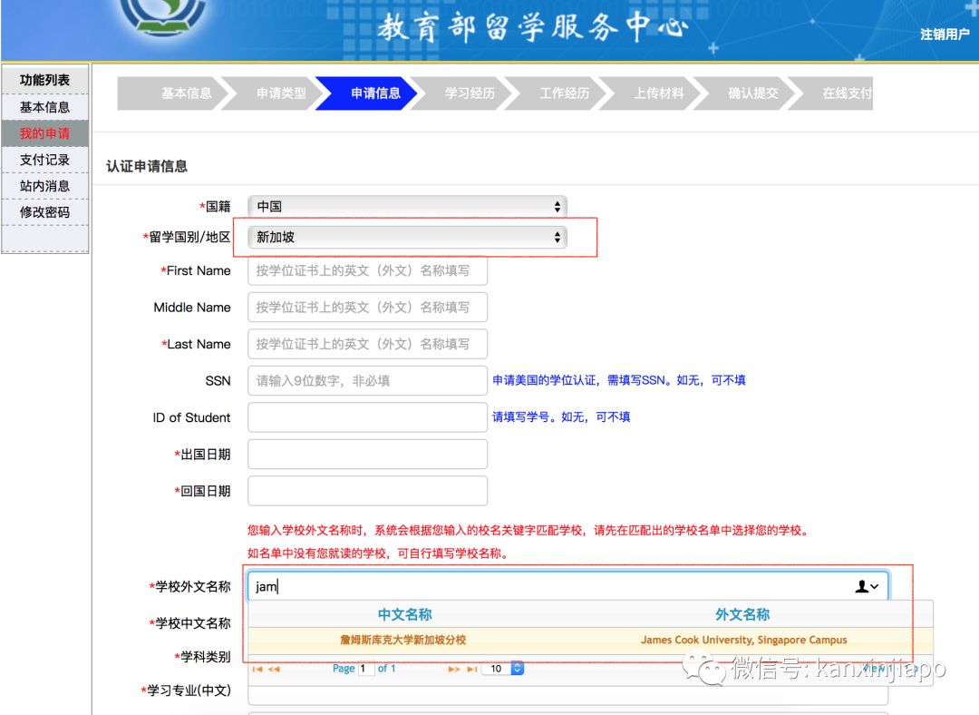 下图为教育部中国留学服务中心国(境)外学历学位认证系统截图,选择留学国别/地区为新加坡之后,在学校外文名称处输入大学英文名称时,詹姆斯库克大学新加坡校区的全称将会自动弹出。