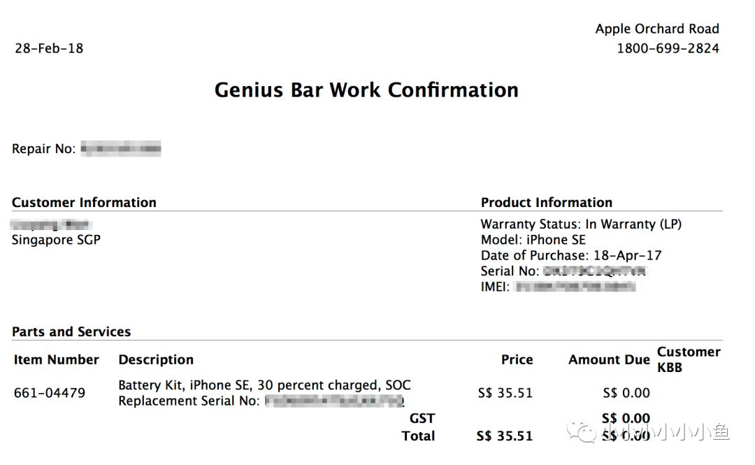 维修费用,算上GST刚好38新币。不过由于我的iPhone还在warranty之内,就免费了。